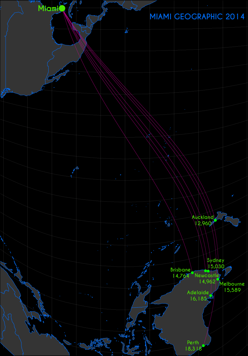 Miami_WC_Distances_OCEANIA Published 2014/07/18 at 1666 × 2397 in Into Perspective: Miami World City Distances ← Previous Next → Miami Geodesic Distances (KM) to World Cities — Oceania View. Base Layer Data Source: Natural Earth. 2014. Map Source: Matthew Toro. 2014.