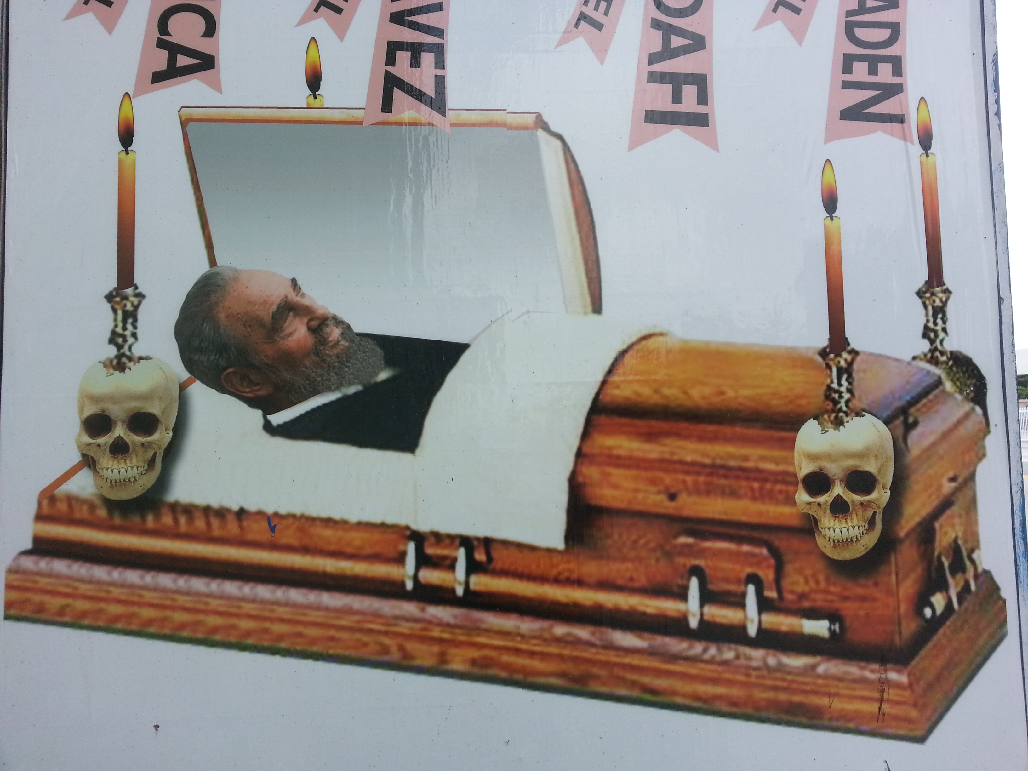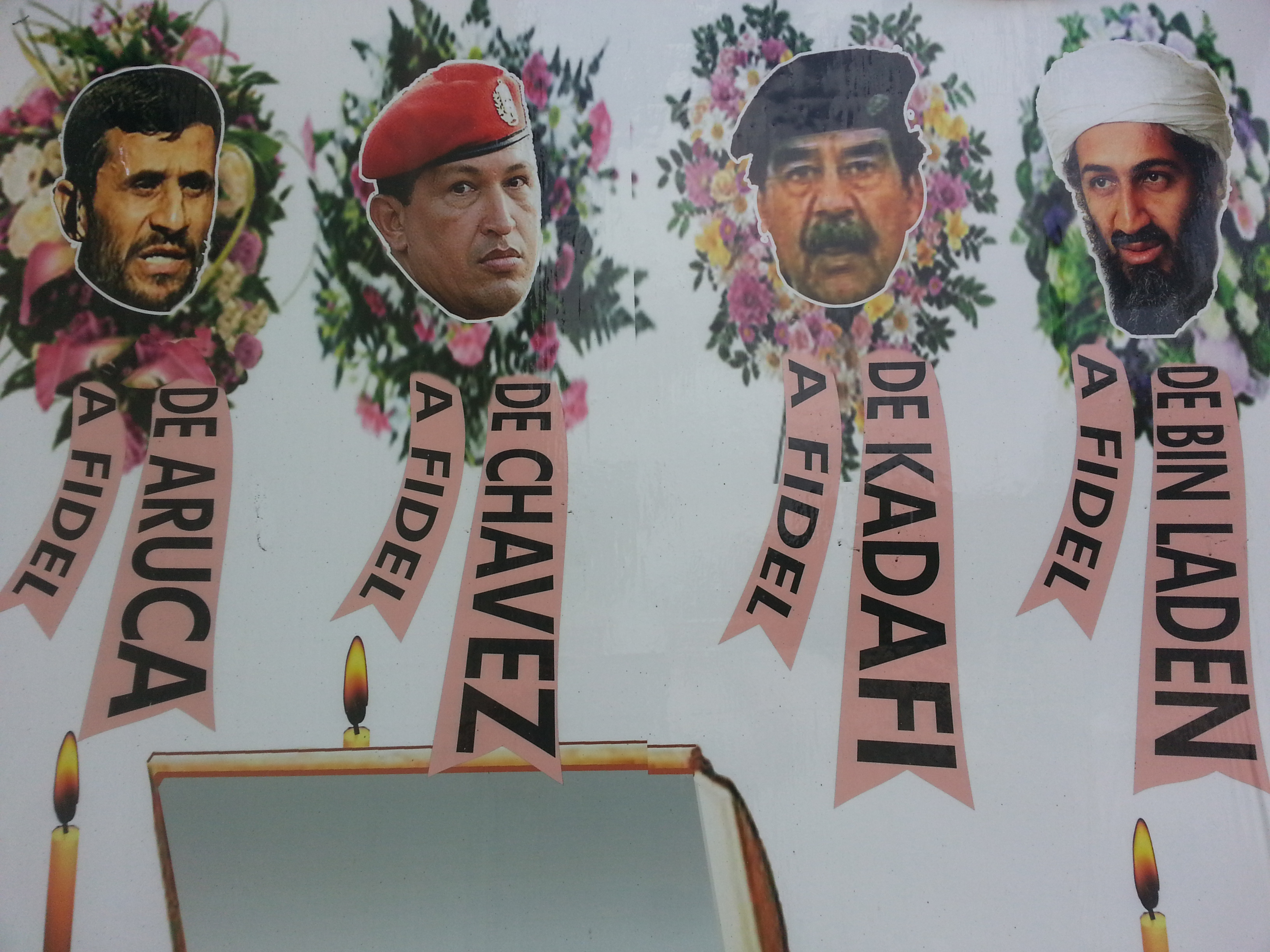 Populist Cuban Propaganda. Note that Mahmoud Ahmadinejad’s face doesn’t match the name “Aruca” (for Franciso Aruca), nor does Saddam Hussein’s match the name “Kadefi” (for Muammar Gaddafi). It seems that disliked public figures can be alternated on this particular sign. Source: Matthew Toro. May 10, 2014.
