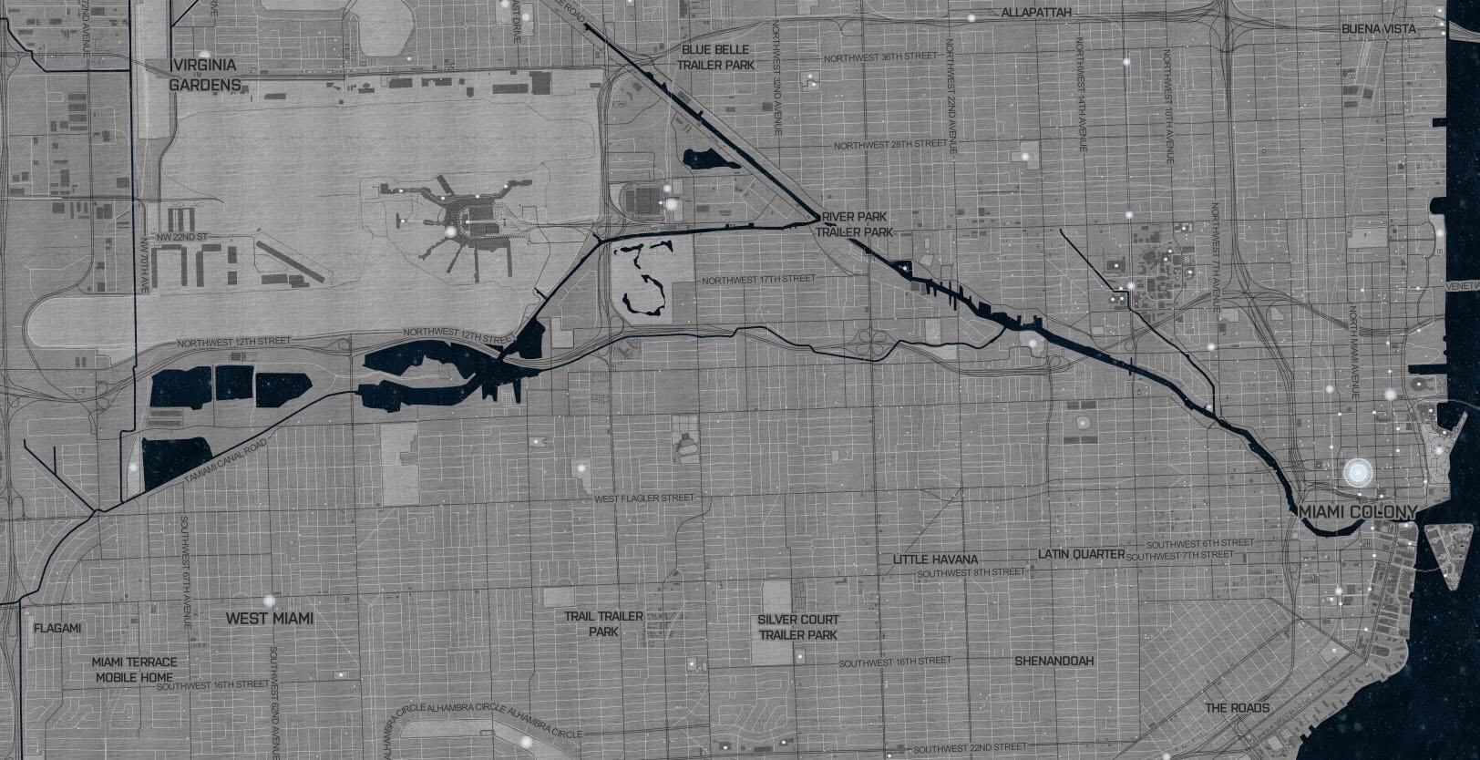 Space Station Earth’s Miami Colony via Map Box. Airport to Bay. Source: Mapbox: Space Station Earth. 2014.