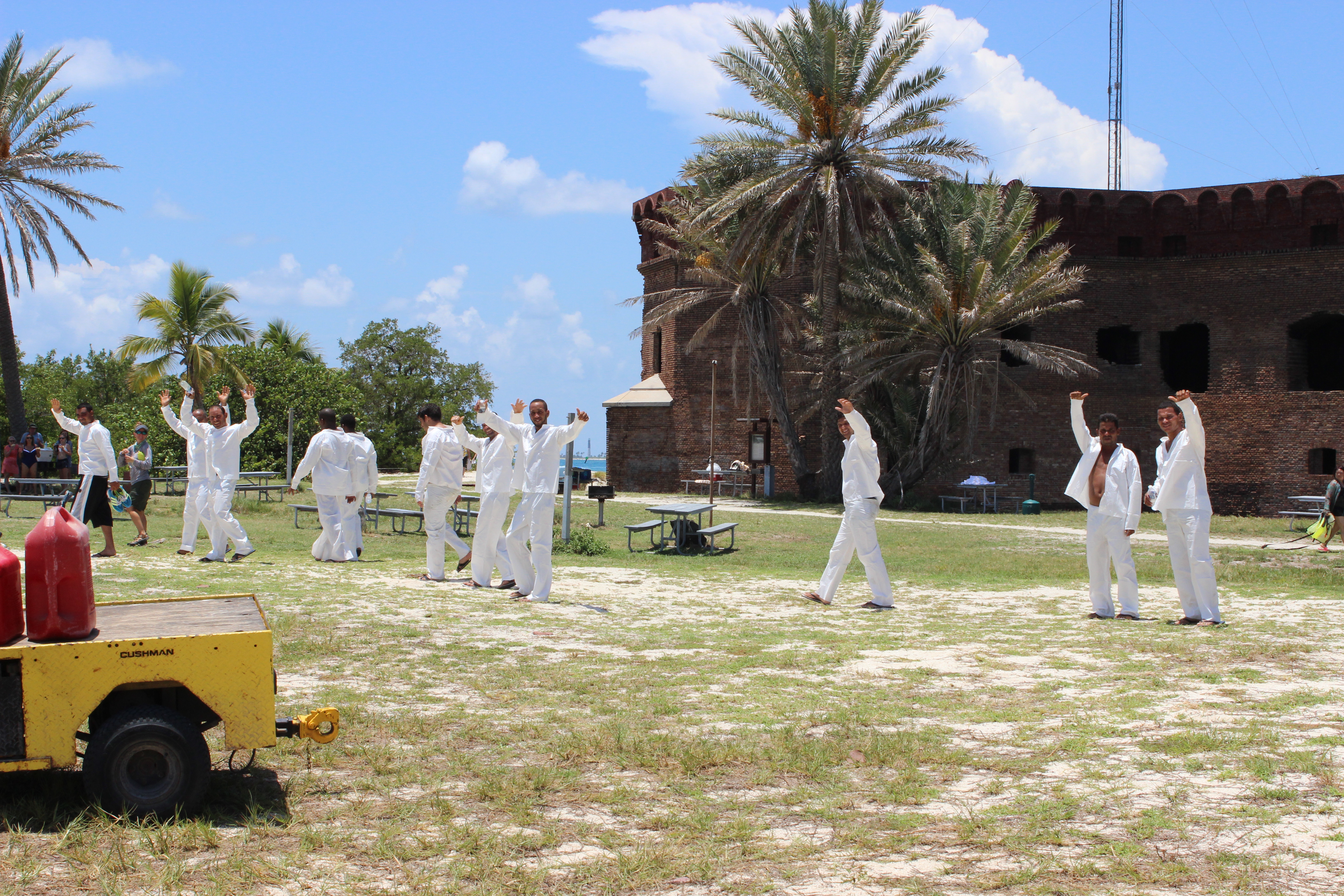 A couple hours after arriving, the men emerge from the residential quarters at Fort Jefferson in fresh white clothing provided by the park service. Photo Source: Matthew Toro. August 4, 2015.
