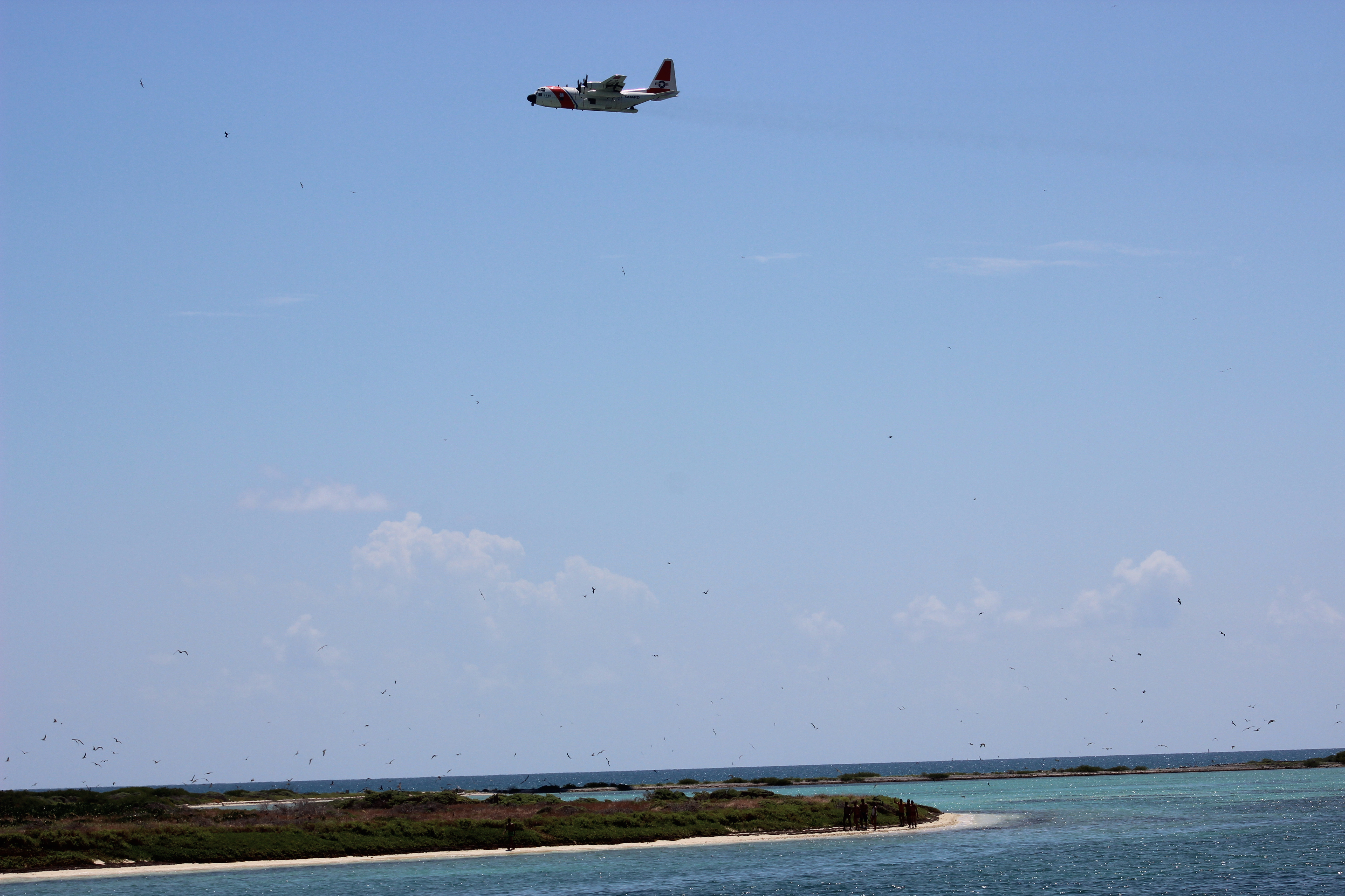 A United States Coast Guard patrol plane circles above Dry Tortugas National Park after identifying the group of Cuban immigrants. Photo Source: Matthew Toro. August 4, 2015.